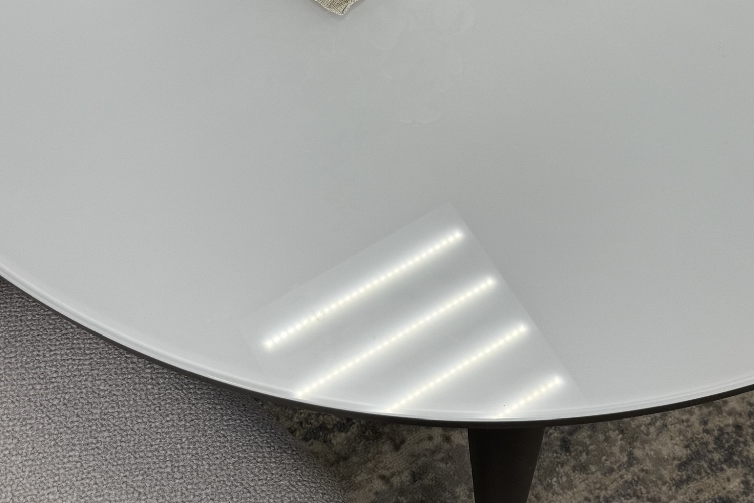 Столешница из стекла надежно защищает стол от влаги и горячего. Для данного стола применяется дорогое, просветленное стекло optiwhite которое передает чистый, яркий цвет без зеленого бутылочного оттенка. Стекло надежно крепится к подложке из ЛДСП на герметик, распределенный по всей поверхности столешницы.