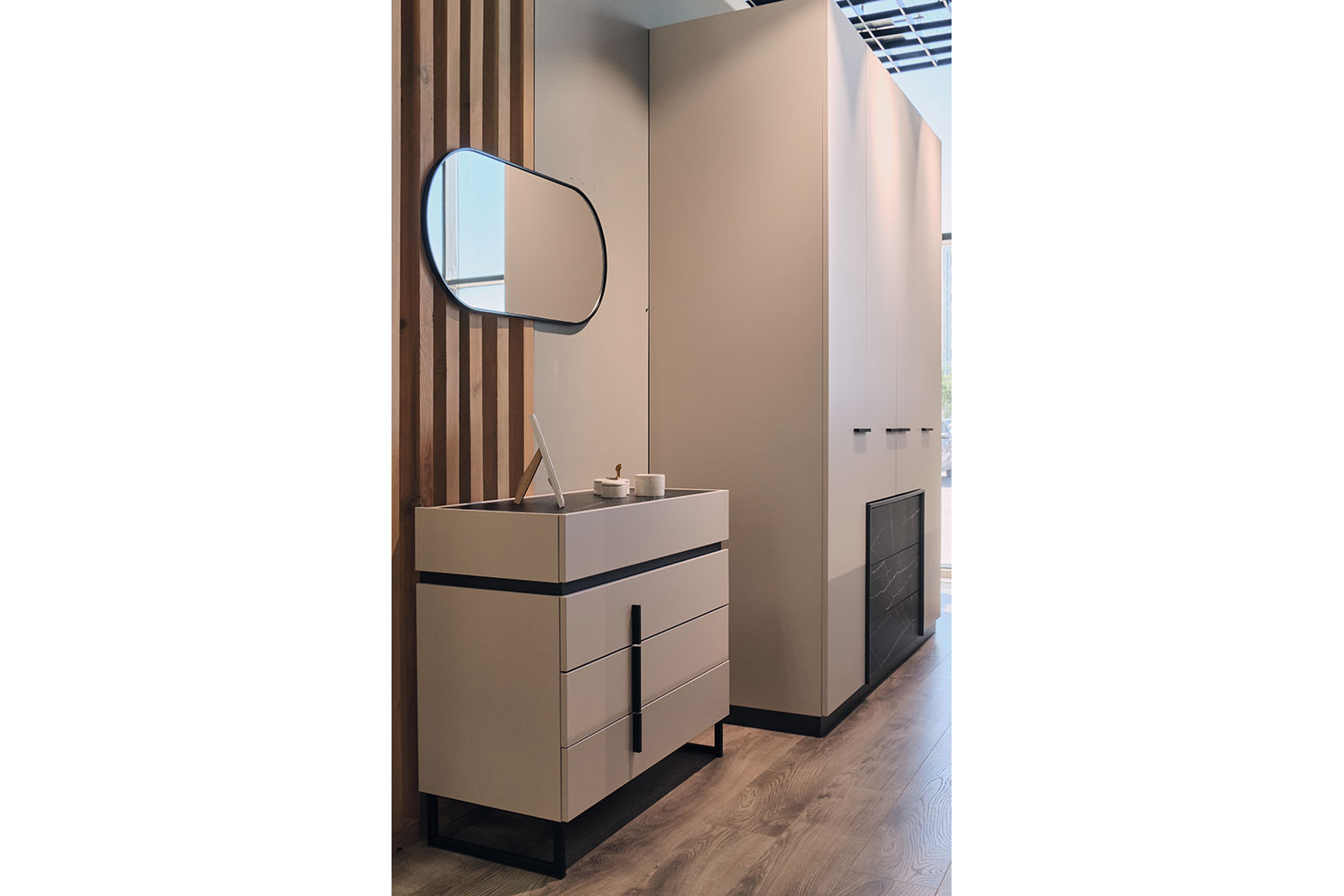 Все модули гармонично сочетаются друг с другом. Черный акцентный мрамор добавляет коллекции изысканности и роскоши, а выразительная геометрия тонких черных ручек на фасадах, перетекающая в линию опор, придают ей современный вид.